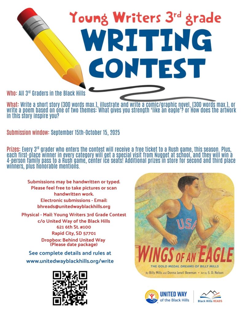 Every 3rd grader who enters the contest will receive a free ticket to a Rush game, this season. Plus, each first-place winner in every category will get a special visit from Nugget at school, and they will win a 4-person family pass to a RUSH game, center ice seats! Additional prizes in store for second and third place winners, plus honorable mentions.